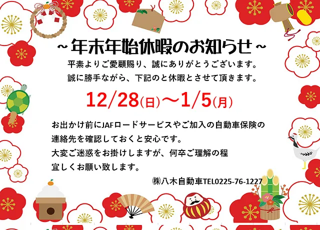 ※お休み期間中の急なトラブルの際は、JAF等をご利用いただけますようお願い申し上げます。